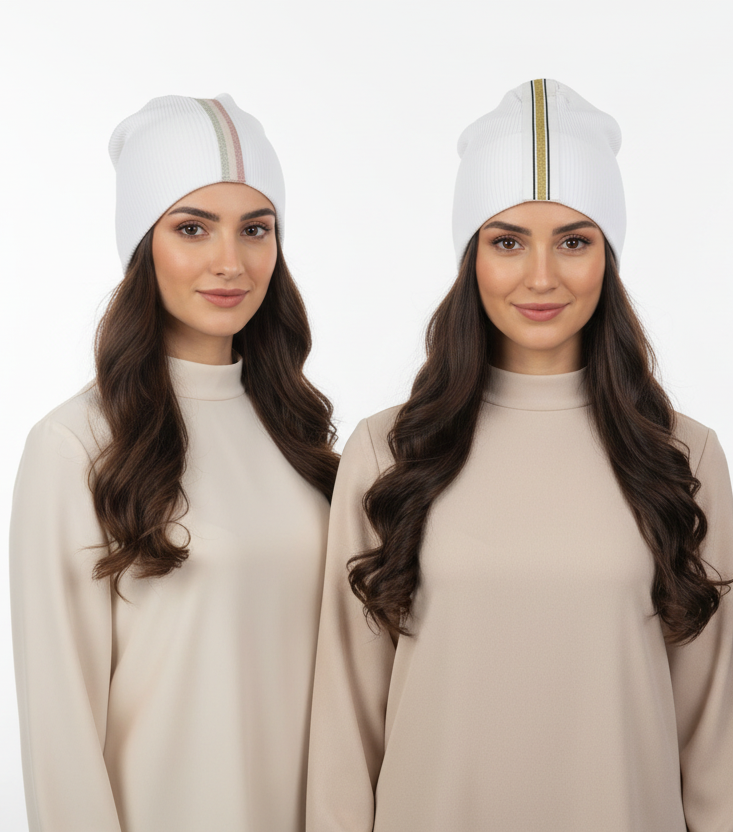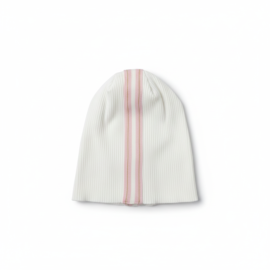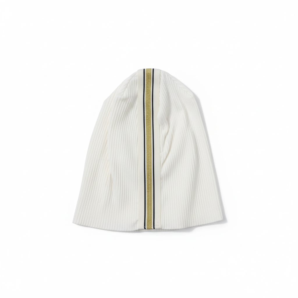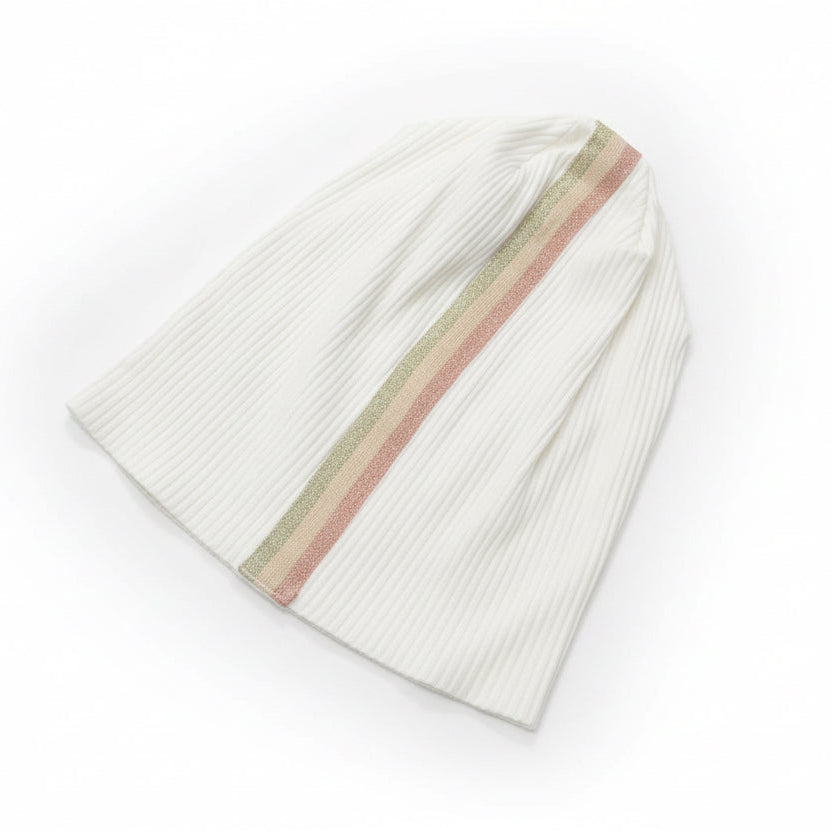 Discover effortless elegance with our Pleated Cotton Beanie featuring a stunning striped trim down the center. This sophisticated head covering combines classic white pleated cotton with beautiful metallic-accented stripes, creating a look that's both timeless and modern.