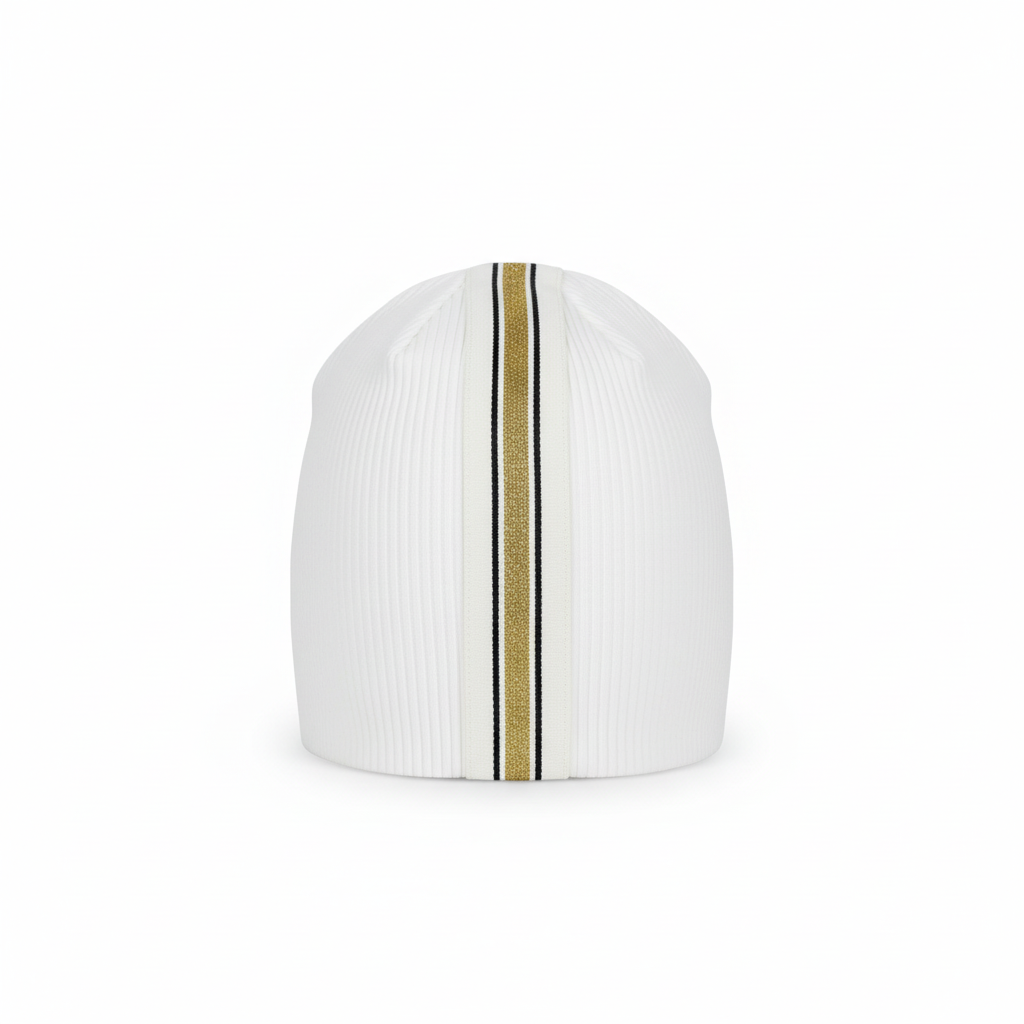White beanie with vertical gold and black trim