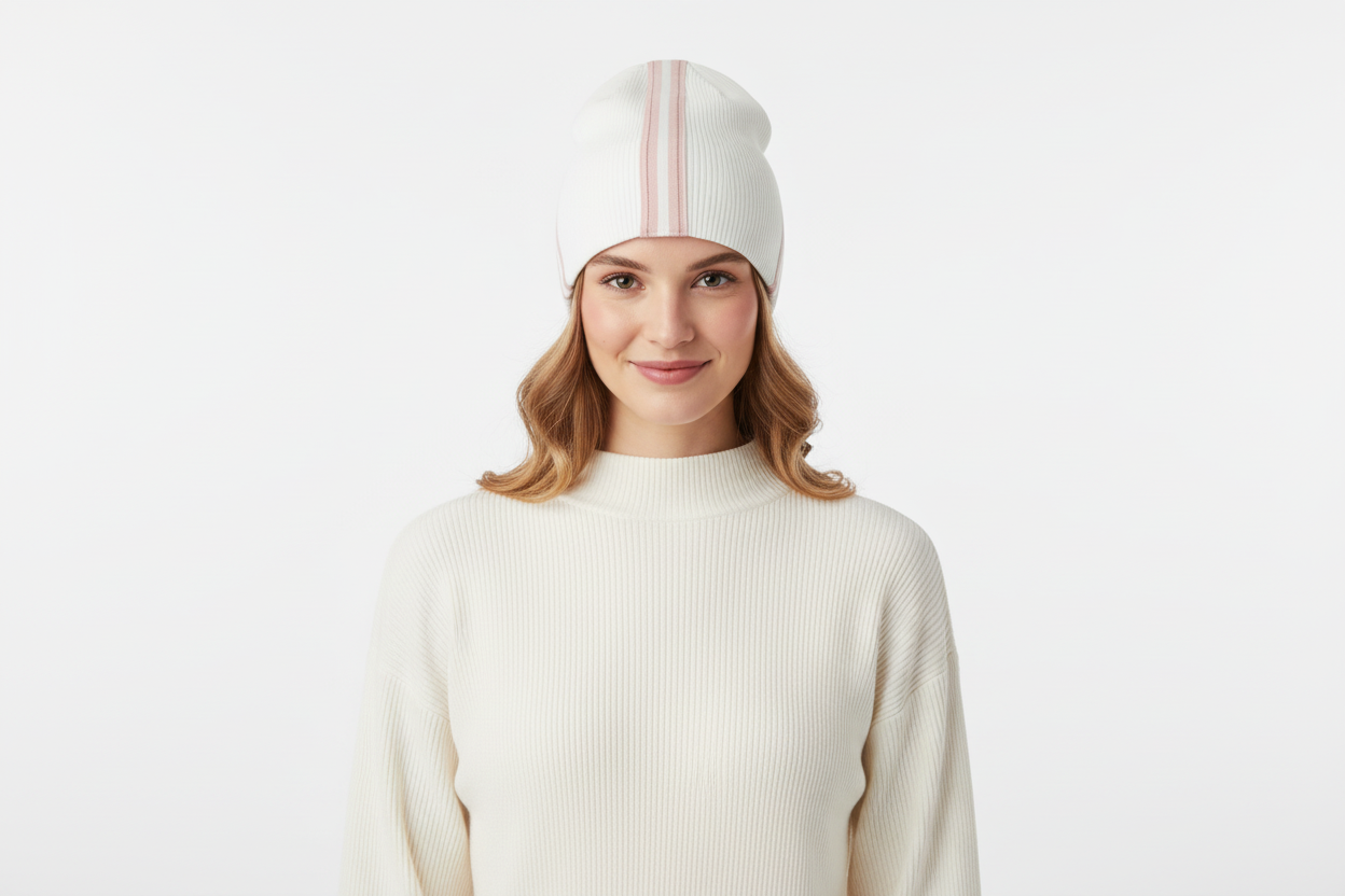 Model wearing white beanie with rose gold trim